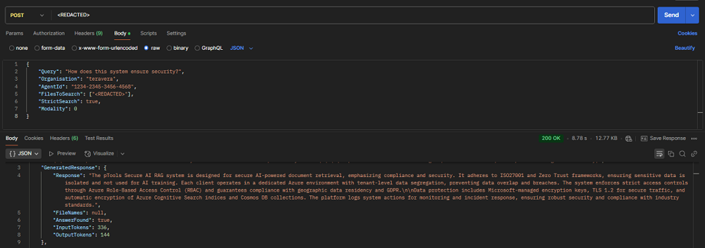 Sample request to Teravera Secure AI headless API via Postman Platform